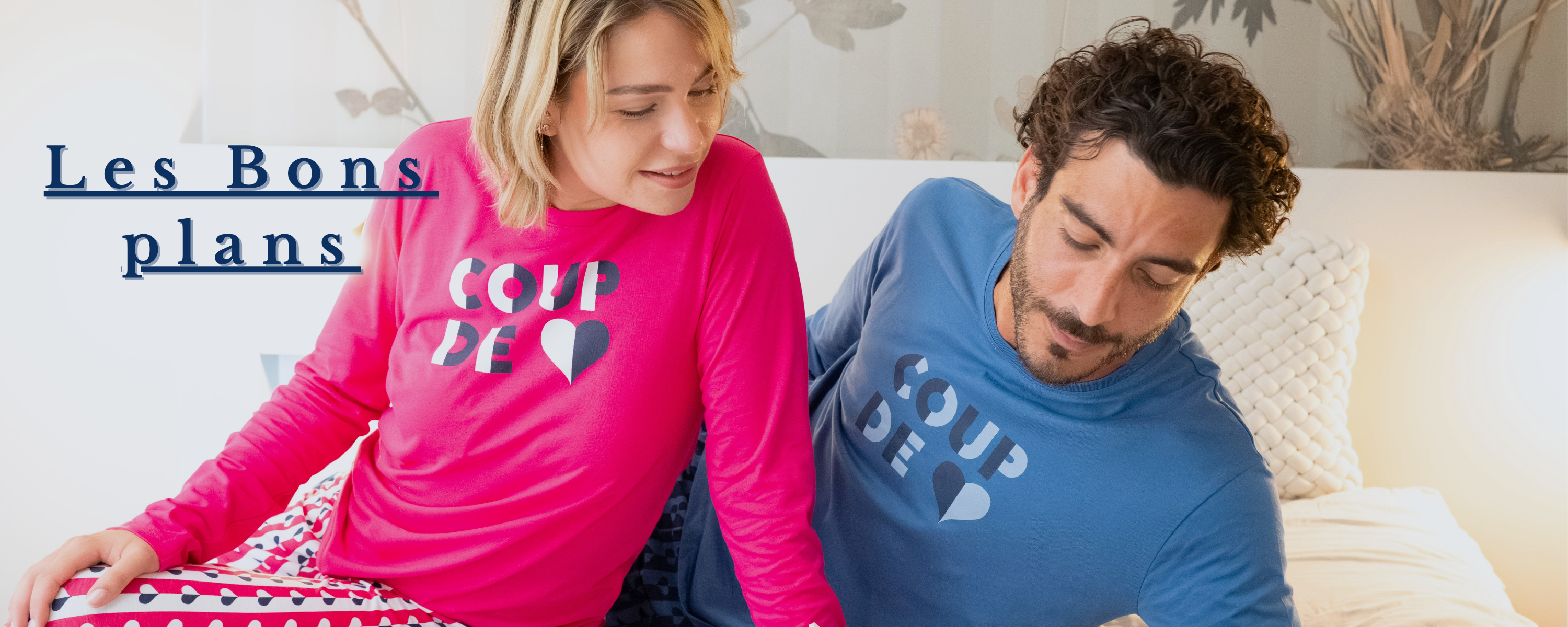 En pyjama, chemise de nuit, ou pyjashort Coup de Coeur, c’est tout l’univers cocooning à l’allure romantique que vous vivrez chaque jour. Nos modèles exclusifs et intemporels aux looks charmants sauront chaque jour vous séduire davantage.