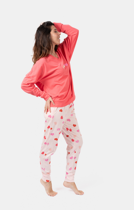 Pyjama Femme long col V oversize - 100% coton - COEURS